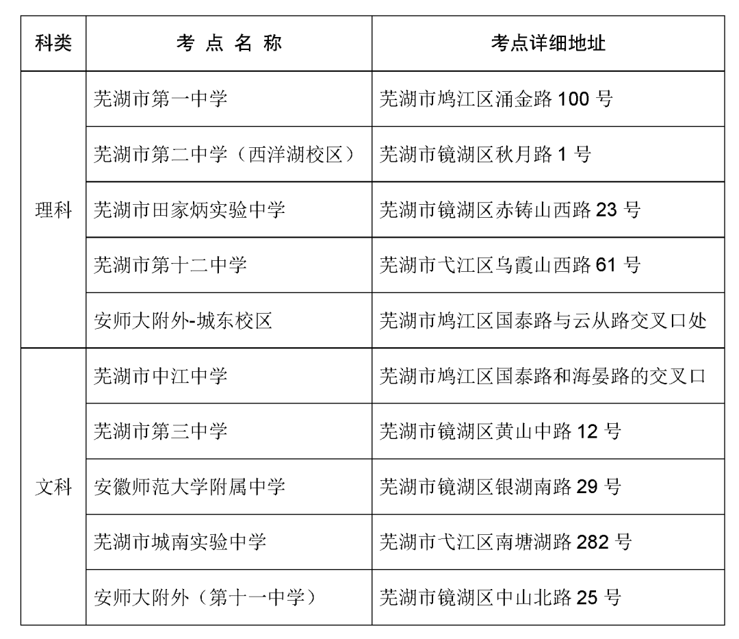 市区:共设十个考点,分别为芜湖市第一中学、安徽师范大学附属中学、芜湖市第十二中学、芜湖市田家炳实验中学、芜湖市第二中学-西洋湖校区、芜湖市第三中学、安师大附属外国语学校(第11中学)、芜湖市城南实验中学、安师大附属外国语学校-城东校区、芜湖市中江中学。