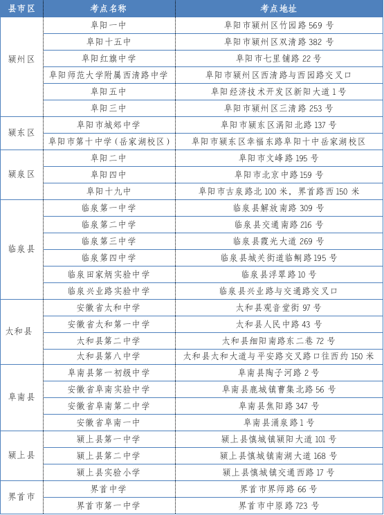 谯城考区:亳州一中、亳州二中、亳州三中、亳州五中、亳州十八中、亳州三十二中,共6个考点、417个考场、12426名考生。