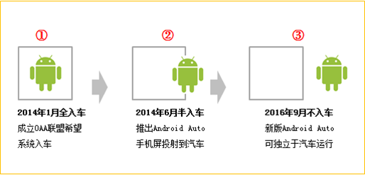 2015年谷歌没有在Android Auto上做很大的更新。2016年5月有一定的升级,包括引入Waze地图、向汽车企业开放开发应用的权限以及提出Android Auto独立版本,也就是11月9日发布的东西。从这两年多的时间可以看出谷歌在汽车联网化方面的实践路线,用一个简图来表示: