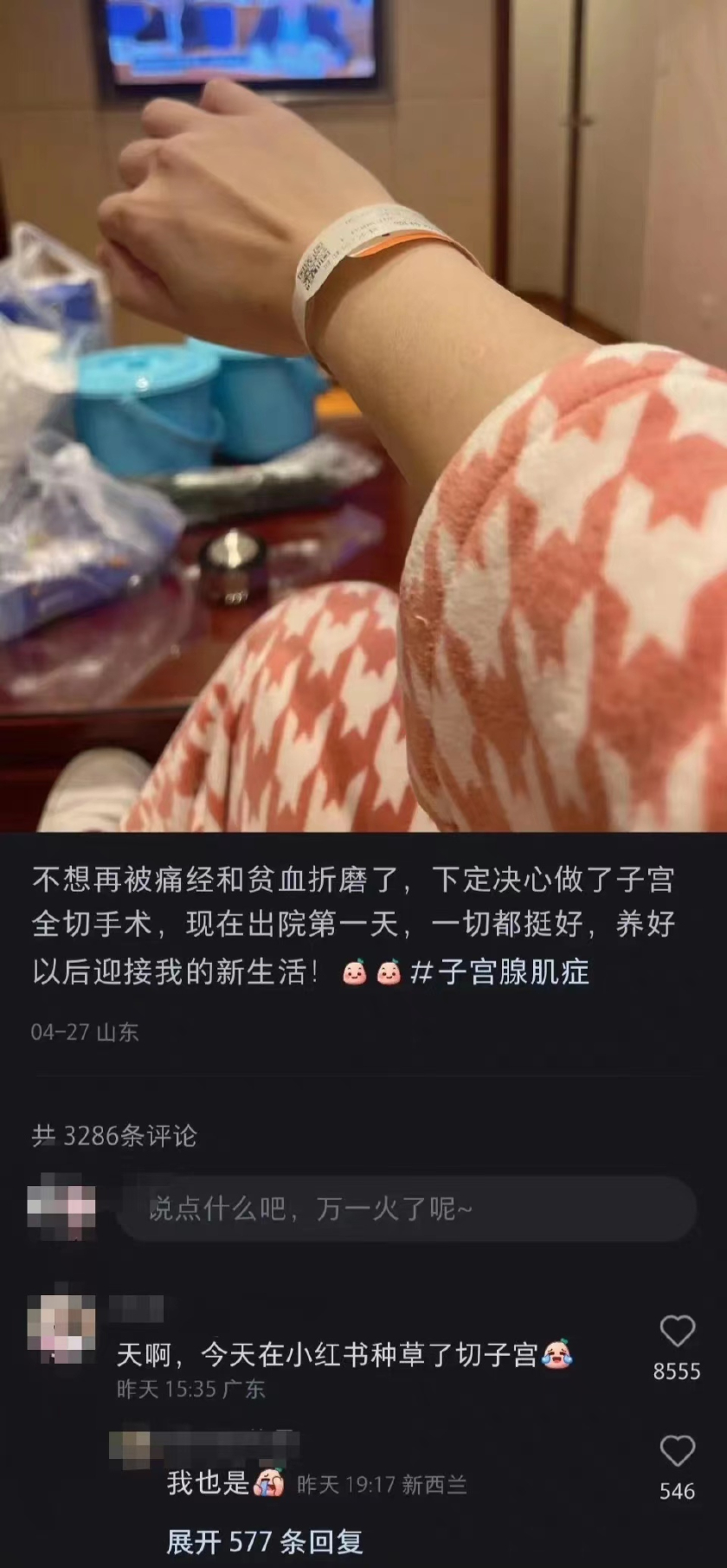 换而言之,该博主并非是为了单纯避免痛经,而是实实在在有疾病在身,最终选择了切除子宫。实际上,这也是不少在小红书上分享切除子宫经历的网友的共同点。