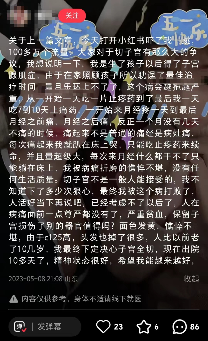 目前,该分享已被删除。这位博主也在5月8日发布了最新回应。其表示,“我是生了孩子以后得了子宫腺肌症,由于在家照顾孩子所以耽误了最佳治疗时间,曼月乐环上不了了,这个病会越拖越严重。”“我被病痛折磨的憔悴不堪,没有任何生活质量。切子宫不是一般人能接受的,我不知道下了多少次狠心,最终我被这个病打败了,人活好当下再说吧,已经考虑不了以后了,人在病痛面前一点尊严都没有了,严重贫血,保留子宫损伤了别的器官值得吗? 面色发黄,憔悴不堪,由于c125高,头发也掉了很多,人比以前老了10几岁,我最终下定决心子宫全切。”
