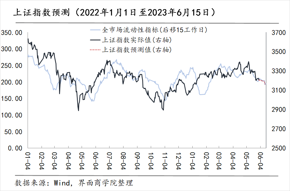 对于6月上半月(6月1日至6月15日)的走势,我们以重置后全市场流动性指数后移15个交易日作为上证指数变动预测的依据,可以看到后移的流动性指数与上证指数的吻合度相对较高。