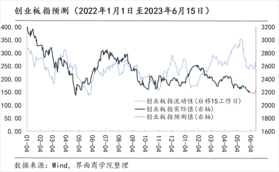 上图中,深蓝色实线为创业板指各交易日实际值,红色虚线为创业板指预测值。测算结果显示,6月上半月(6月1日至6月15日)预测区间内,创业板指指数有望实现反弹。同时,当前流动性指数与实际指数走势偏离幅度较大,依照历史走势分析,指数回归将呈现为两者缺口收缩,创业板指亦存在向上动能。