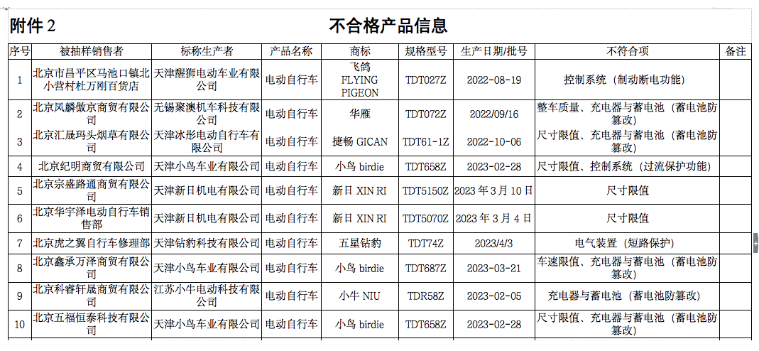 不合格品牌包括飞鸽、华雁、捷畅、小鸟、新日以及小牛等。