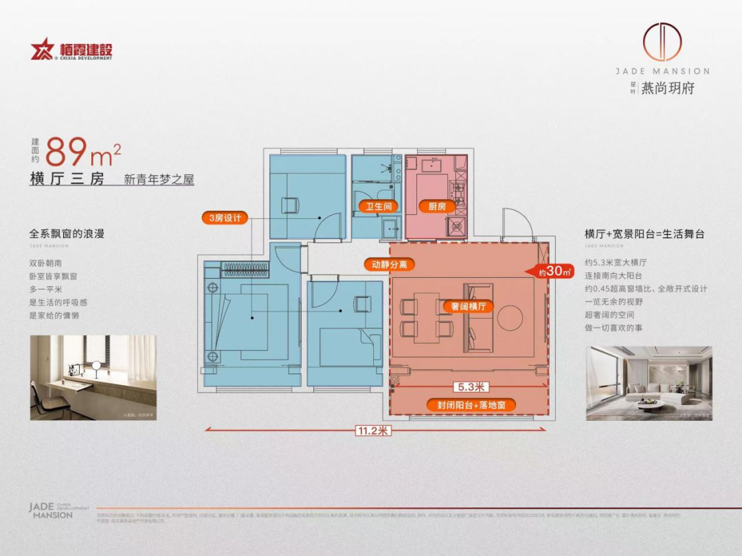 打造建面约89、120、126㎡三种户型,全系横厅设计,并且是区域内首次引入露天泳池,配备私家会馆,栖霞建设在产品打造方面再度深拓。建面约89㎡的三房一卫户型: