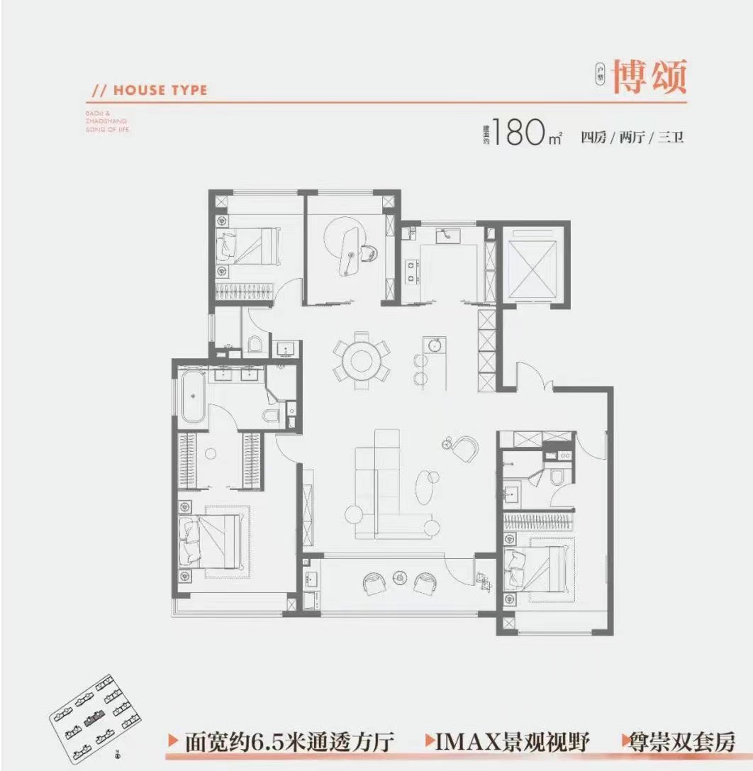 建面约180㎡户型:四房两厅三卫,中西双厨设计,朝南双套房,主卧套房含步入式衣帽间+双台盆独立卫浴。