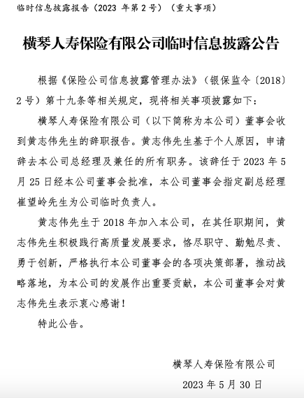 5月30日,横琴人寿发布公告称,董事会收到黄志伟的辞职报告。公告显示,黄志伟基于个人原因,申请辞去横琴人寿总经理及兼任的所有职务,该辞任于2023年5月25日获批,同时,横琴人寿董事会指定副总经理崔望岭为公司临时负责人。