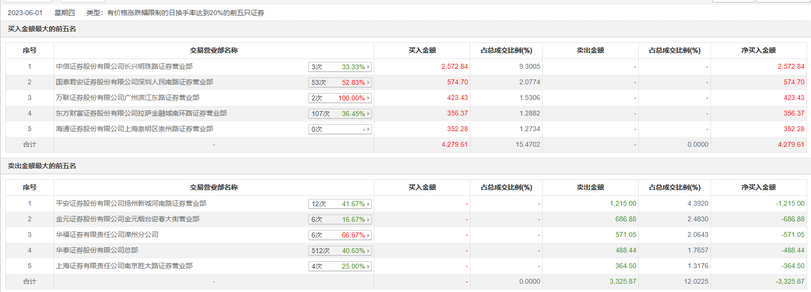具体来看,中信证券长兴明珠路证券营业部、国泰君安证券深圳人民南路证券营业部分别买入2572.84万元、574.70万元;平安证券扬州新城河南路证券营业部、金元证券金元烟台迎春大街营业部分别卖出1215.00万元、686.88万元。
