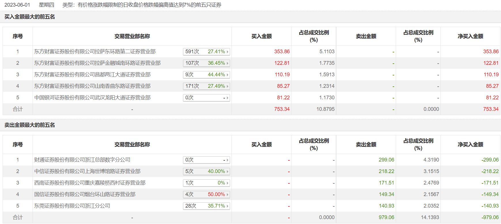 具体来看,财通证券浙江总部数字分公司、中信证券上海世博馆路证券营业部分别卖出299.06万元、218.22万元;东方财富证券拉萨东环路第二证券营业部、东方财富证券拉萨金融城南环路证券营业部分别买入353.86万元、122.81万元。