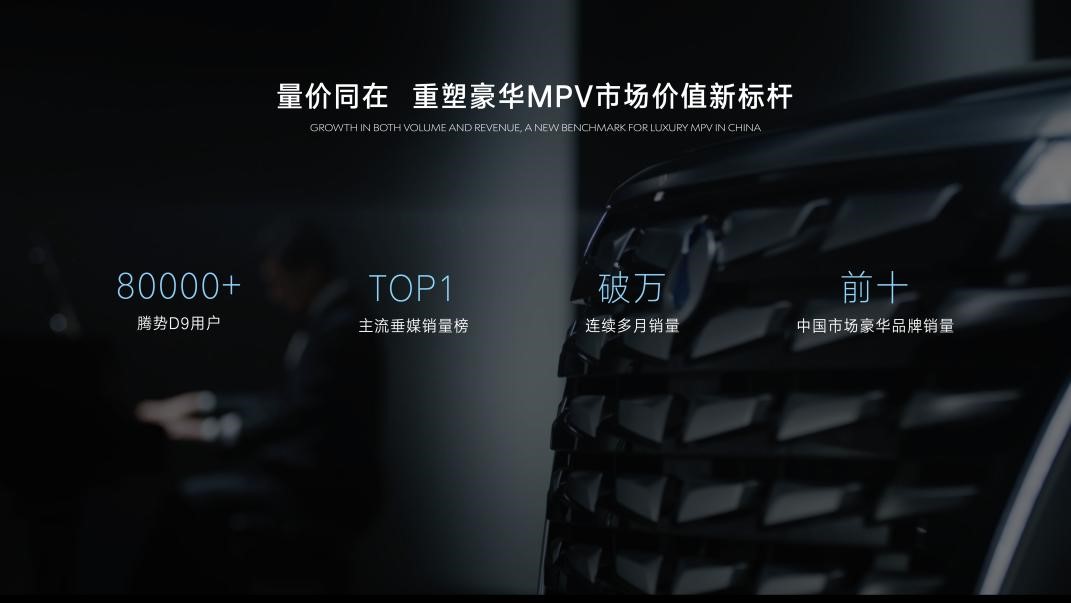 自焕新以来,腾势D9收获了80000+用户朋友的青睐和选择,销量连续多个月破万,而且在各大主流平台,腾势D9销量强势霸榜TOP1,真正的做到了量价同在,助力腾势位居豪华品牌销量榜(中国市场)的前列,其42万的平均客单价,是中国豪华市场上所有中国品牌的最高单价,继续以稳健的姿态树立豪华MPV市场价值新标杆。