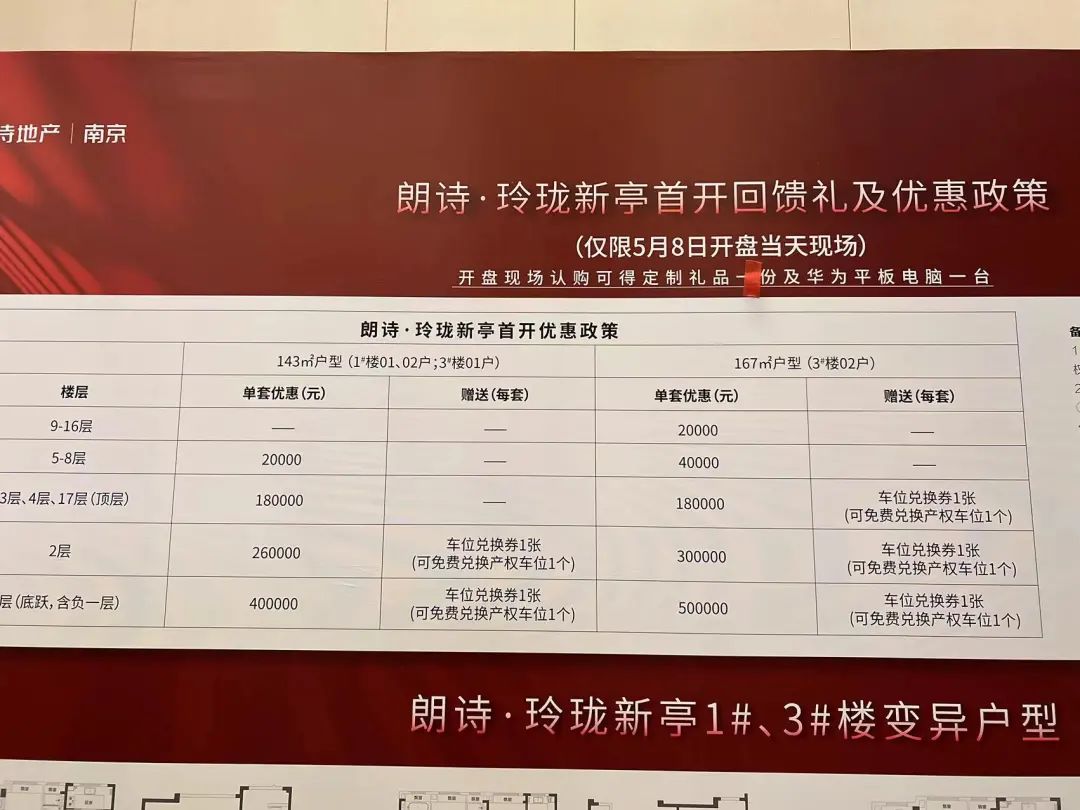当时项目首开还推出了优惠政策,在开盘当日认购成功的可得定制礼品一份及华为平板电脑一台;此外,不同楼层和户型均有特惠,单套优惠2万-50万不等,部分房源还赠送车位抵换券一张……
