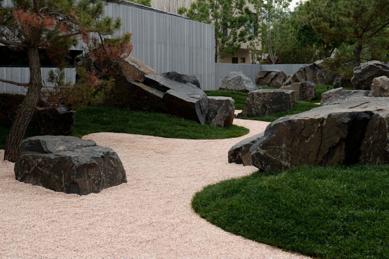 庭院的造景由厐喜主笔,整体以枯山水园林理念为主体,运用多元自然材质,探讨人与自然的平衡。门禁与酒店主楼铜质大门,由一条绵延十数米的石质长径衔接,园林层次的递进与景致的变幻营造一场身心灵洗尘的抵达体验。