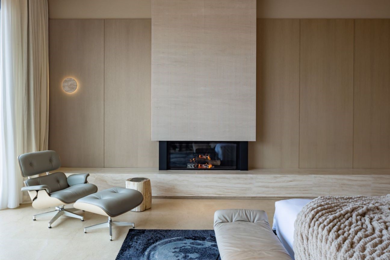 酒店的12间客房分布于主楼的两个楼层,每间都以简约流畅的线条、法国白洞石、北美橡木等以奶油色和米色为基调的天然材质,配合柔和温暖的隐藏式照明系统,与造型极富戏剧性和雕塑感的当代名家设计家具,包括Wassily扶手椅、Herman Miller出品的Eames躺椅、定制自Freifrau的Leya床尾凳等。