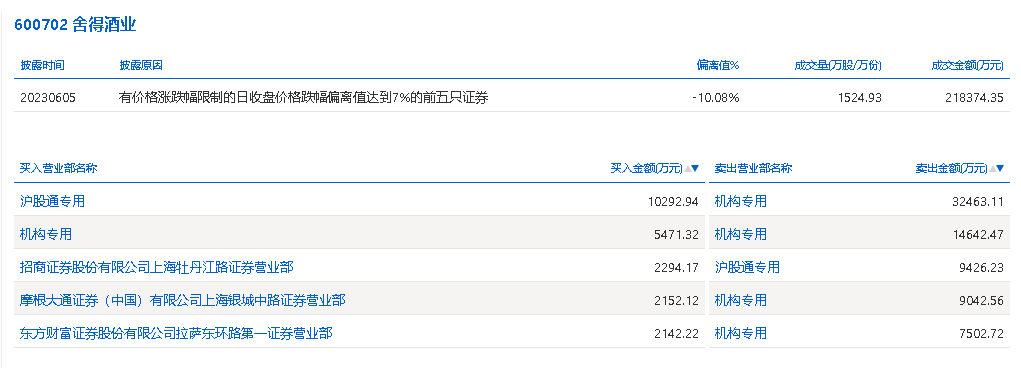 6月5日,舍得酒业今日跌停,成交额21.84亿元,换手率4.61%,盘后龙虎榜数据显示,沪股通专用席位买入1.03亿元并卖出9426.23万元,1家机构专用席位净买入5471.32万元,4家机构专用席位净卖出6.37亿元。