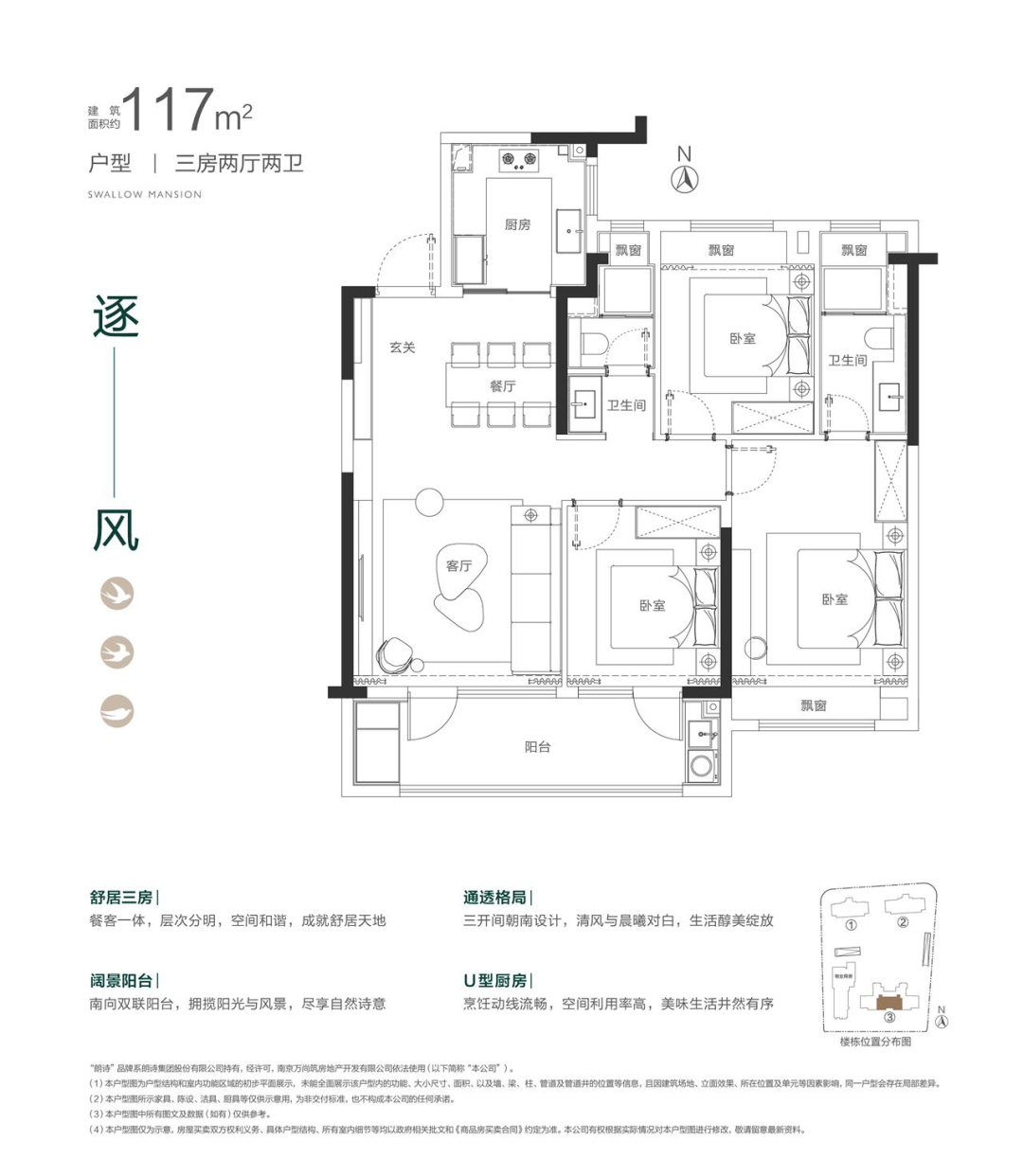 建面约117㎡的三房两厅两卫: