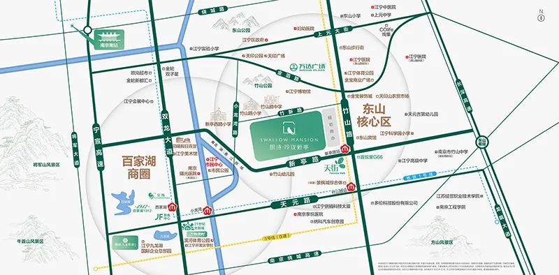 项目位于江宁核心区,临近地铁5号线(在建)新亭路站,靠近龙湾天街商业综合体、江宁市民中心等,项目附近还有竹山公园、秦淮河,景观资源优越,周边居住氛围浓厚。