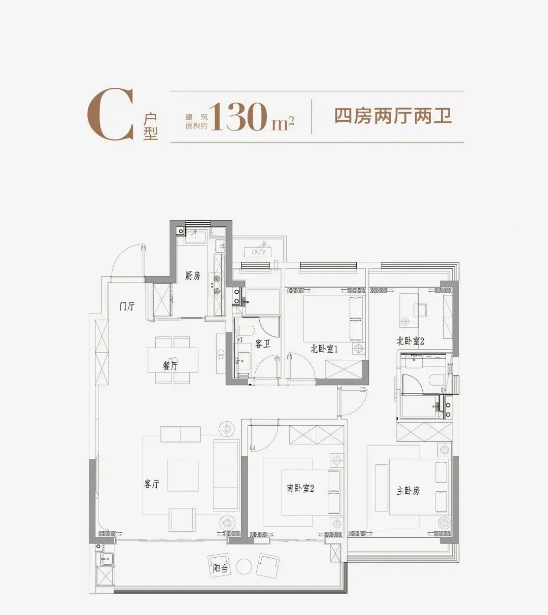 建面约130㎡的四房两厅两卫户型: