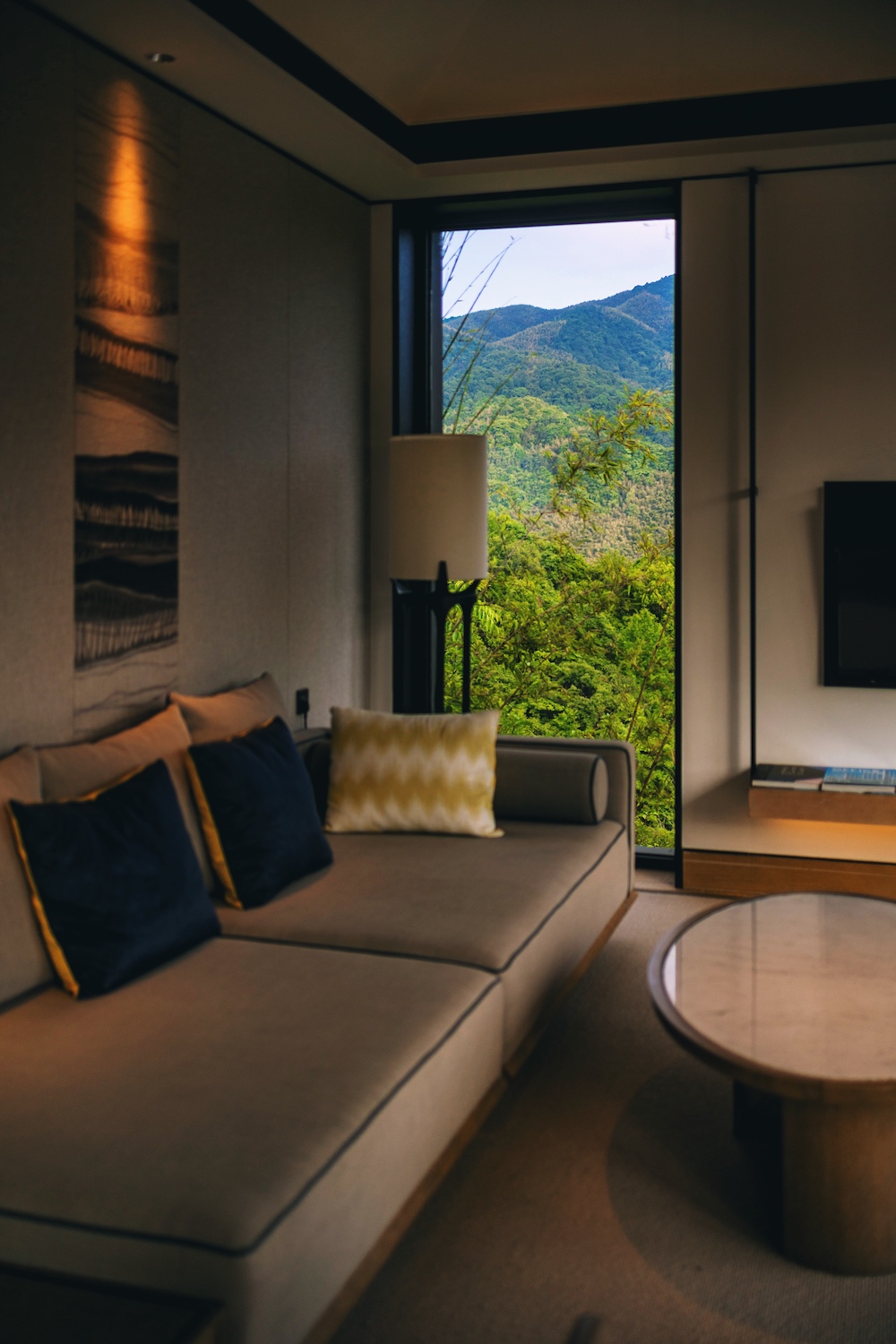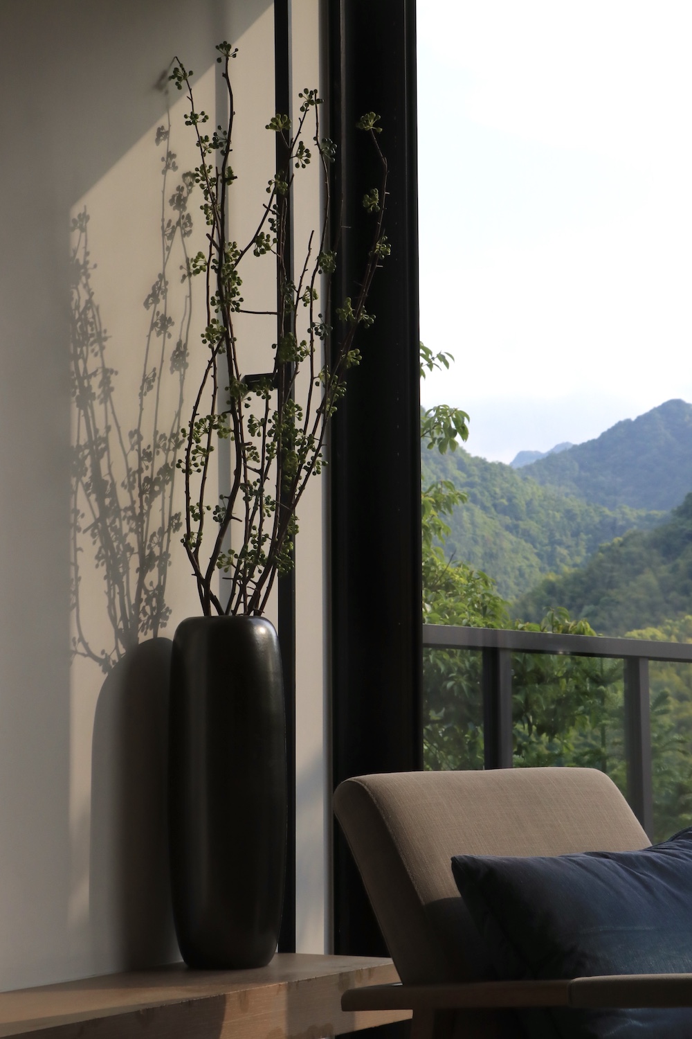 在室内设计上,宁海安岚将现代亚洲设计与本土风情特色相结合,创造出新意十足的空间体验。所有房间一面墙体都采用落地窗设计,无论是在客厅还是卧室,都能时刻置身于青山秀水之中。房内的木质家具为清冷的大自然增添了几分暖色,阳光透过百叶窗打在墙面上,在风吹树叶的作用下变幻出不同的形状。窗外的超大露台,非常适合沏一壶好茶,与好友共话情长,向外远眺,目之所及皆是绿意。夜幕降临,还能在屋内浴缸感受温泉的疗愈,释放日间的疲惫。
