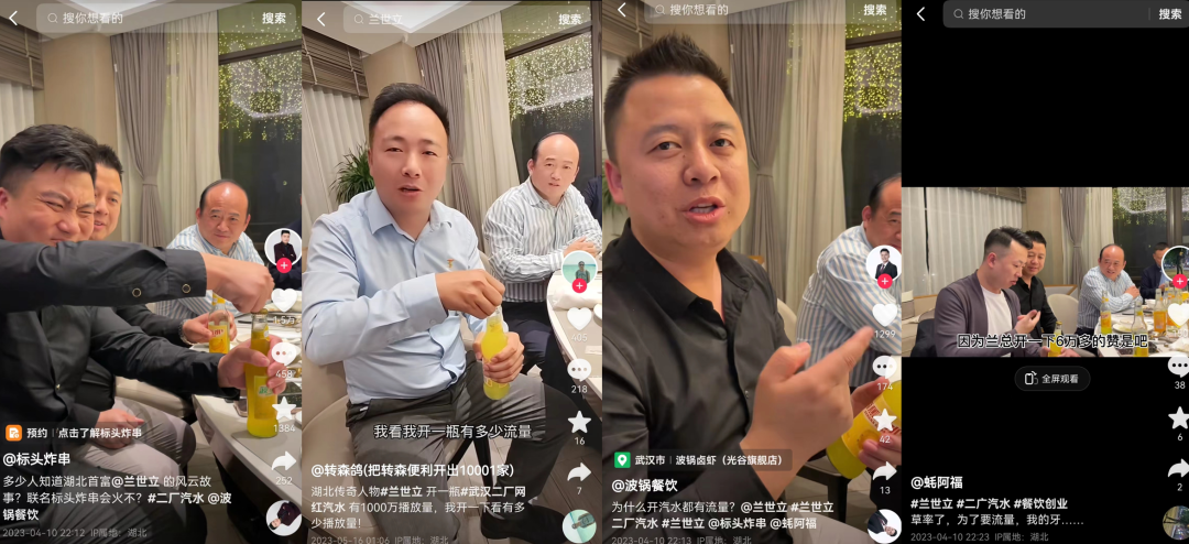 4月以来,兰世立的社交媒体中频繁出现“二厂汽水”的相关视频,内容包括其到汽水工厂考察、在饭局上与其他人共饮二厂汽水等。