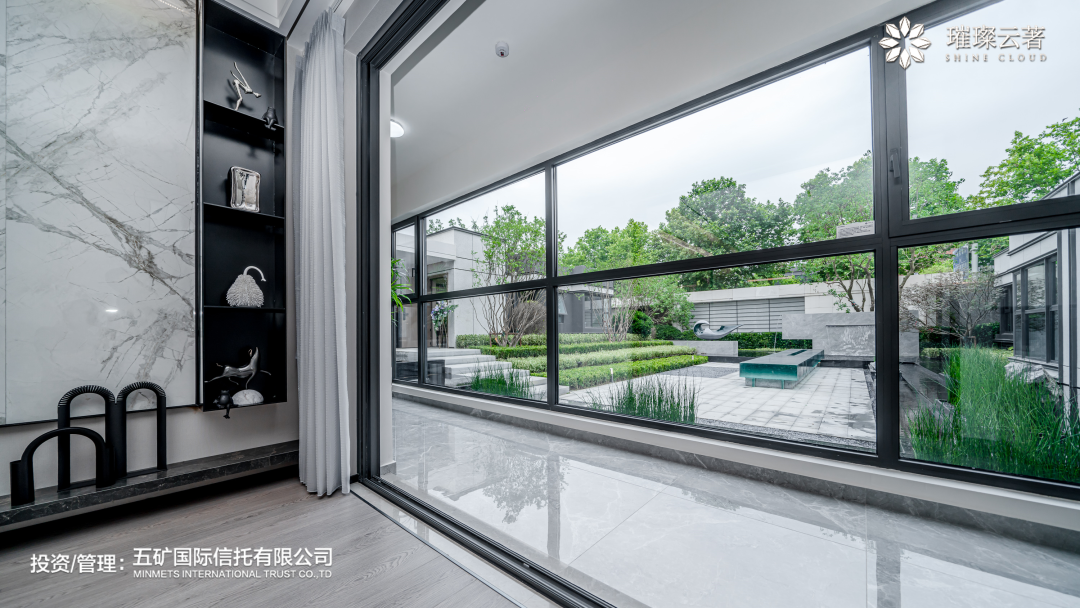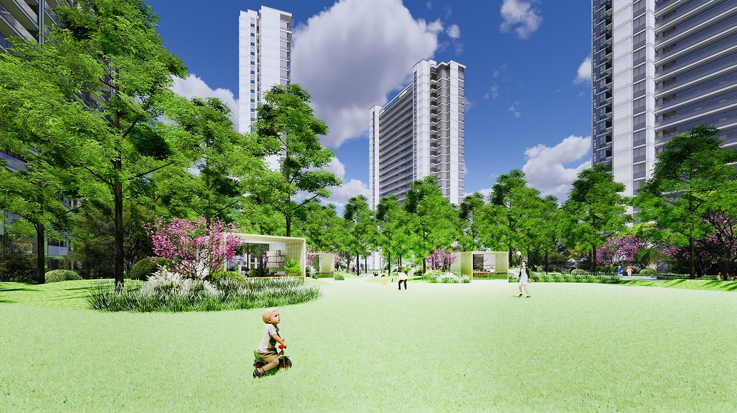 景观上,项目通过采用围合式排布为景观及视野拓宽改善的想象空间,纵向最大、约70M楼间距,横向超200米无遮挡视野空间,拉开1.4万方中央景观,0.45的超高窗墙比,将风景全部纳入家中。