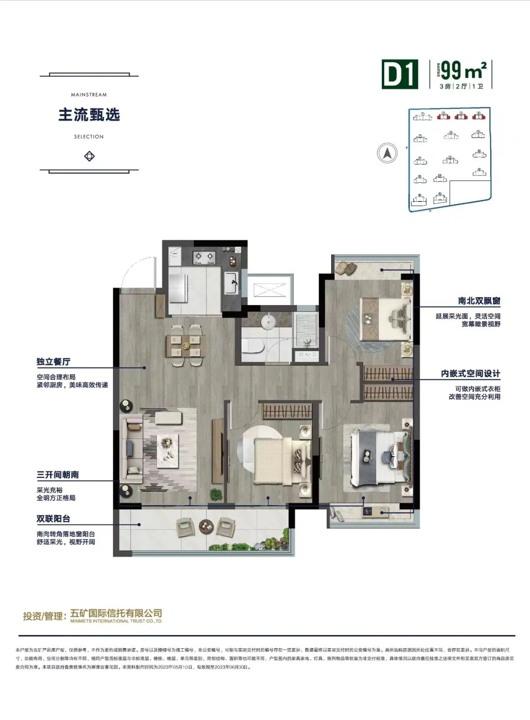 建面约99㎡三房两厅一卫户型,三开间朝南,南向双联阳台连通客厅和南向次卧,三个卧室均带飘窗,南北双飘窗设计,内嵌式设计充分利用空间。