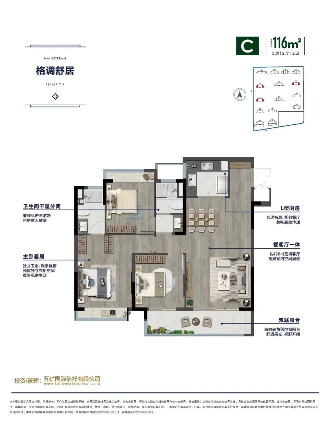 建面约116㎡三房两厅两卫户型,三开间朝南,南向双联阳台连通客厅和南向次卧,L型厨房,主卧套房设计,南北双飘窗设计。