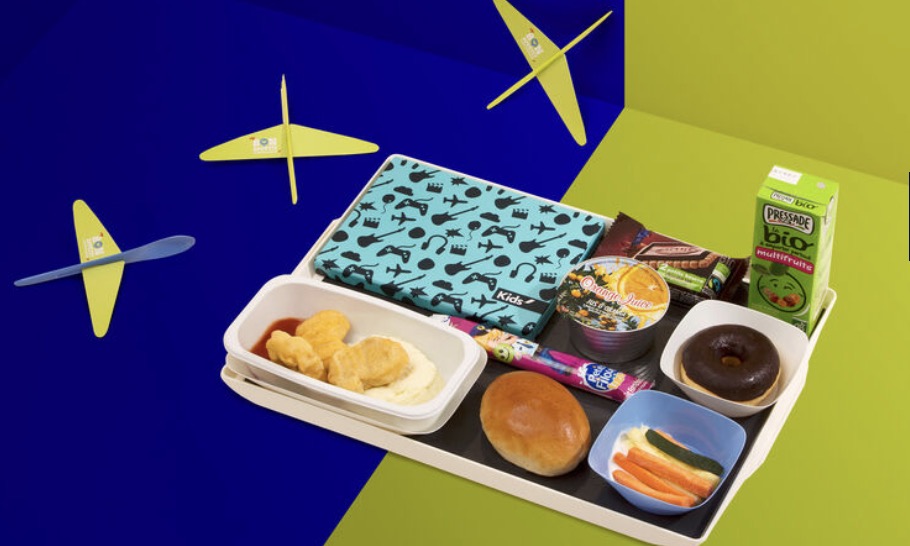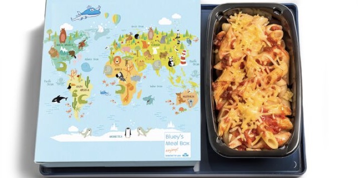 颜值高、造型可爱的餐具,往往能吸引小朋友的注意力,饭都能多吃“二两”。一些航空公司细心地考虑到小乘客的口型和使用习惯,推出特制餐具,包括更合适的餐勺弧度和安全锋利程度。法国航空的飞机餐向来声名在外,提供的儿童餐不仅采用有机食材,符合孩子口味,而且还使用方便的趣味餐具装盛。著名设计师欧金尼·库勒为法航的儿童乘客设计了一套趣味铝塑餐具,其中的刀叉可组装为飞机造型,不仅能辅助孩子更好进食,还能让大人更省心;荷兰航空大蓝卡通形象Bluey则出现在彩色的儿童餐餐盒上,每个餐盒中都会有吉祥物 Bluey,以及儿童飞行员冒险游戏或儿童飞行员证书,0至2岁的婴幼儿则可免费获得一个 Bluey 围嘴。