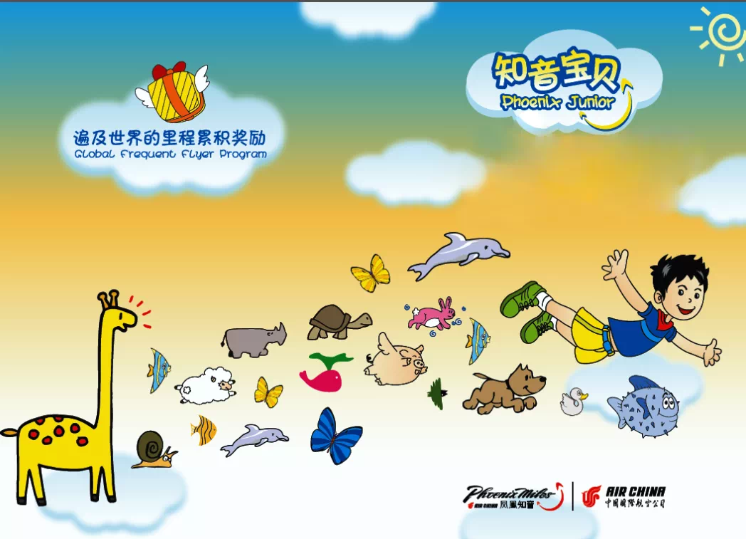 国航是中国首家推出针对儿童旅客计划的航空公司,早在2007年“知音宝贝”儿童卡就问世了。“知音宝贝”儿童卡专为2-12周岁(不含)的儿童会员设计,须有一成人卡与之关联,领卡后跟着大人的每次飞行都可以累积里程到自己的账户里,家长的里程也可以按照一定比例转赠到“知音宝贝”账户。等到小朋友满12岁之后,会自动转成国航凤凰知音俱乐部的正式会员。
