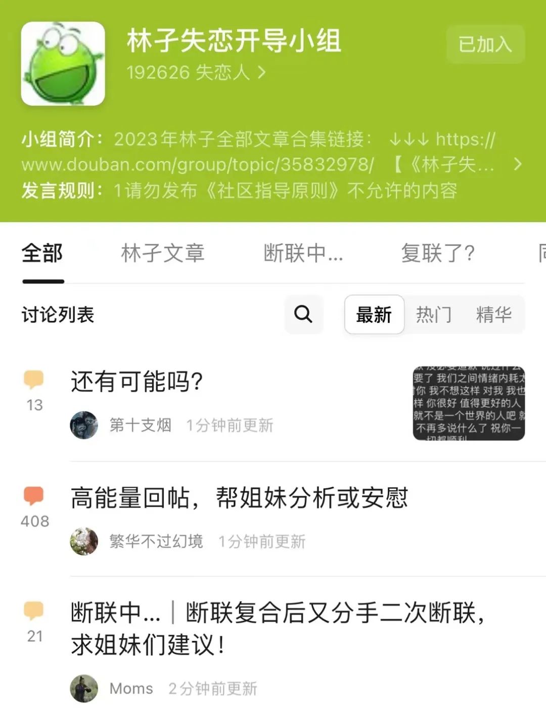 2016年,豆瓣用户“雪地女王”也开始在“林孑失恋开导小组”发帖。她围绕“能量学”构建新的断联理论体系,该帖目前已有近10万条评论,收藏量高达1.3万,一举奠定了雪地女王在情感咨询界的江湖地位。