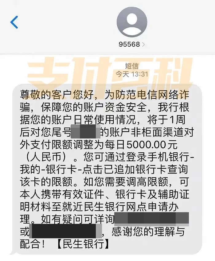 近日,「支付百科」注意到有网友收到了民生银行发来的限额短信,称为防范电信网络诈骗,保障用户的账户资金安全,民生银行根据账户日常使用情况,将于1周后对尾号***的账户非柜面渠道对外支付限额调整为每日5000.00元(人民币)。用户可通过登录手机银行我的-银行卡-点击已追加银行卡查询该卡的限额。如需要调高限额,可本人携带有效证件、银行卡及辅助证明材料至就近民生银行网点申请办理。