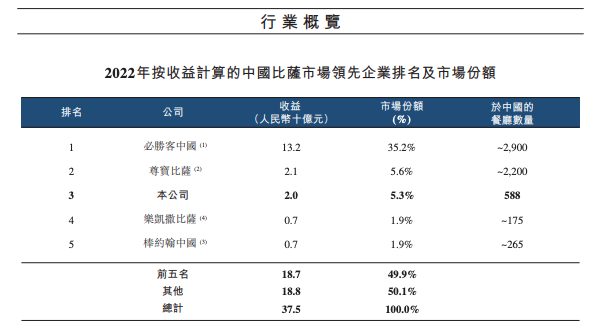 眼下的比萨这一品类在中国的市场格局中,达美乐中国只能排到第三——按2022年销售收入计算,必胜客中国以132亿元的收益、约2900家餐厅居企业排名第一,占据35.2%的市场份额;而尊宝比萨以21亿元的年收益,2200家门店,5.6%的市场份额,排名第二;达美乐中国则以20亿元的年收益,588家门店,5.3%的市场份额排名第三。