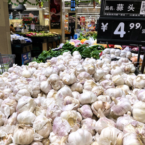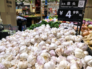各地产区蒜价居高不下也使得城市地区的新蒜价格上涨。记者走访北京市的几家果蔬超市发现,海淀区的几家超市蒜价在4.68-5.99元不等,一家超市工作人员向记者表示,新蒜自上市以来就是这个价格,一直都保持在5.99元/斤,没什么变化。