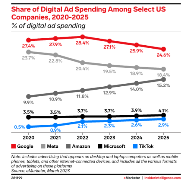 Insider Intelligence报告显示,2022年,Google和Meta在全球数字广告市场的总份额降到50%以下,并预测2023年Google市场份额为25.9%,Meta市场份额为18.9%,高于亚马逊的14%,远高于Microsoft的3.9%和TikTok的2.3%。尽管未来还有进一步降低的可能性,但始终牢牢把守着数字广告市场的龙头位置。