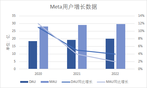 数字广告巨头们的增长数据,更多停留在营收上的相对回暖,而非用户得增长。以Meta为例:2020年,其DAU为18.4亿,同比增长11%,MAU达28亿,同比增长12%;自2021年第二季度开始,用户增长速度明显放缓,全年DAU同比增长5%至19.3亿,MAU同比增长4%至29.1亿;2022年也保持了类似的增长速度。
