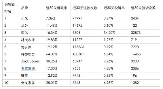 对比过往数据,当年双11的退款率远高于行业均值,两家分列女装与男装成交额第一位的品牌退款率高达64%和38%;家电类成交额排位第一的海尔,在30天内的投诉率则高达54.20%,手机品牌魅族,12.92%的退货率也显得相当不正常;销量全品类第一的小米则再30天内被退款7万多次,让人大跌眼镜,电商盛宴背后隐藏的虚假的繁荣,在数据面前逐步褪去光芒。