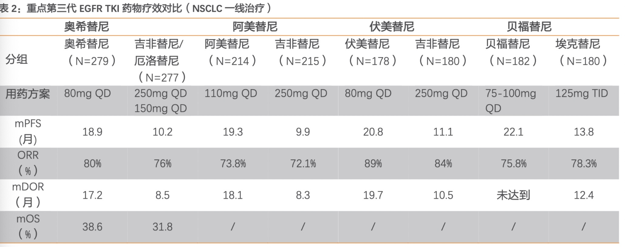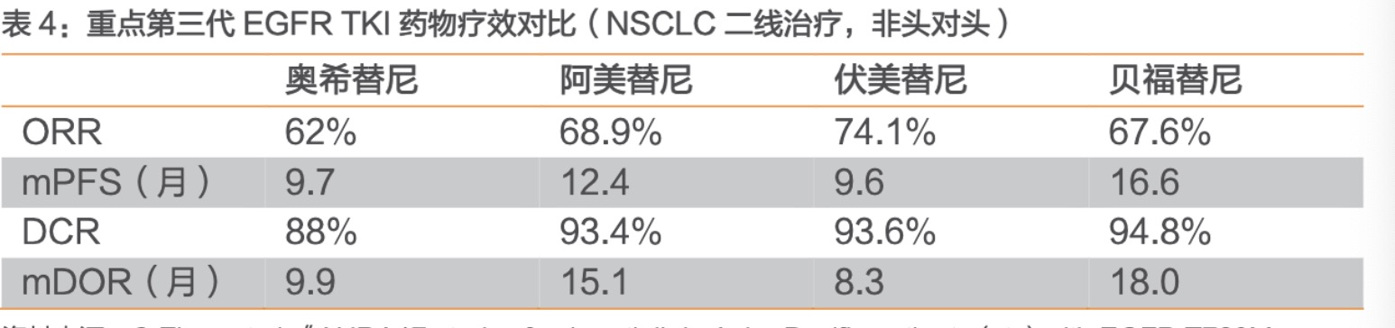 在第三代EGFR TKI的NSCLC二线治疗疗效对比中,贝福替尼也显示最长的mPFS和mDOR(非头对头)。