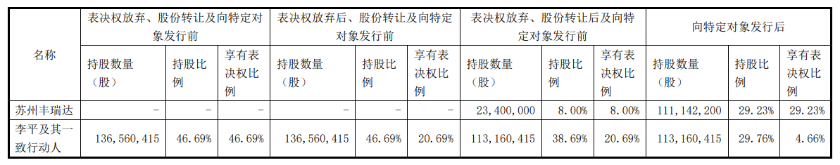 按照协议约定,苏州丰瑞达通过协议转让受让李平持有的上市公司2340万股股份(占上市公司股份总数的8.00%)。在《承诺函(一)》出具之日至36个月满或上市公司向苏州丰瑞达发行股票登记至苏州丰瑞达账户完成并上市孰早之日,李平不可撤销地放弃其所持有的上市公司约7604.3万股股份(占本次发行前上市公司股份总数的26.00%)对应的表决权。