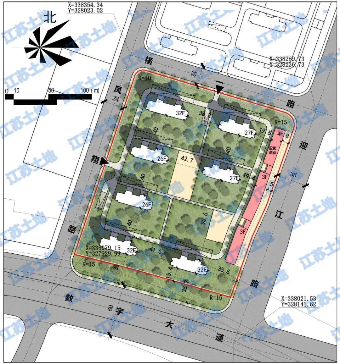 地块内可建7栋26-32层的高层住宅,沿迎江路可布局3-4层的沿街商业,作为片区社区生活配套的补充。