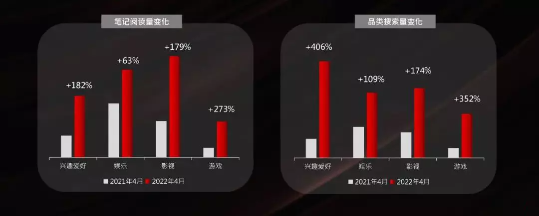 根据小红书官方发布的《2022上半年小红书用户内容消费行为洞察》,由于出行限制、居家时间增多,宅家娱乐相关内容迎来爆发式增长,其中“游戏”类笔记阅读量增长273%;品类搜索增加352%。