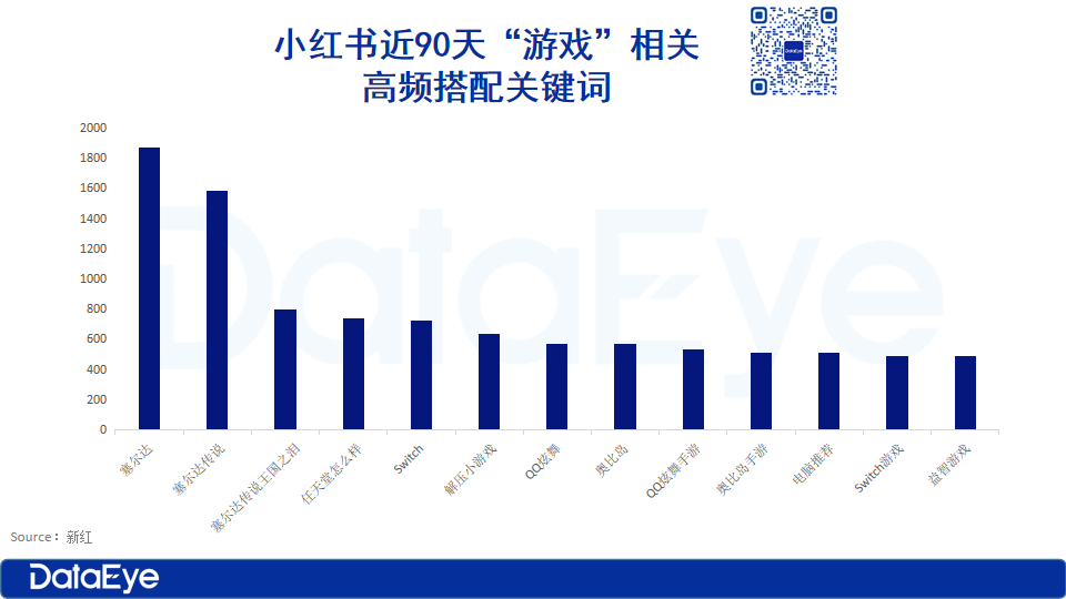 据新榜旗下小红书数据工具——新红数据,“游戏”关键词评论内容、搭配高频词(近90天)显示:“塞尔达”、“解压小游戏”、“益智游戏”、“奥比岛”等等是主要高频词。