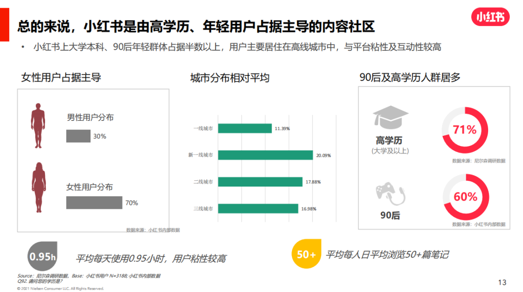 根据小红书2022年数据显示,小红书有超2亿+月活用户,4300万+分享者,72%为90后,50%分布在一二线城市,男女用户比例已升至3:7;人均单日使用时长从2018年的26.49分钟上升至55.31分钟。