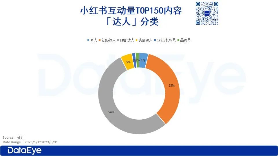 根据新红数据,按互动量排行TOP150内容的达人账号属性:腰部达人占比最高,达54%;其次为初级达人,占比35%;头部达人占比4.6%。