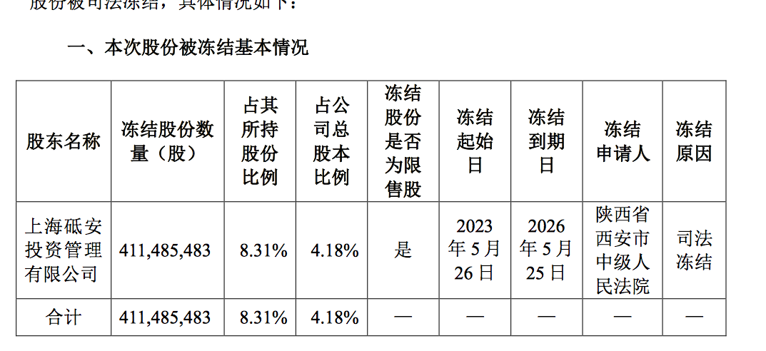 能验证这一说法的还有ST安信新控股股东上海砥安投资管理有限公司(下称“上海砥安”)所持4.18%股份被司法冻结一事,冻结申请人为陕西西安中级人民法院。