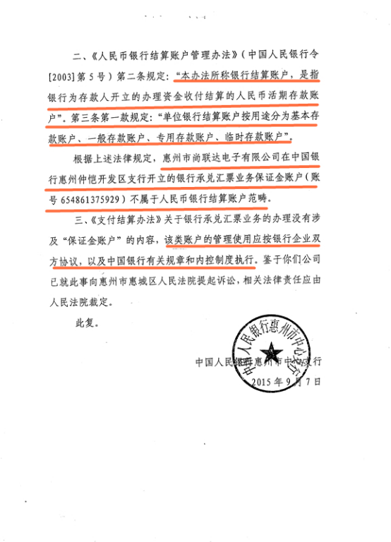 人行惠州分行则认定,涉案保证金账户不属于人民币银行结算账户管理范筹,无需经当地人民银行核准和备案,保证金账户的资金划转、使用在不违反国家法律、法规的前提下,由银行和单位协商,按协议办理。