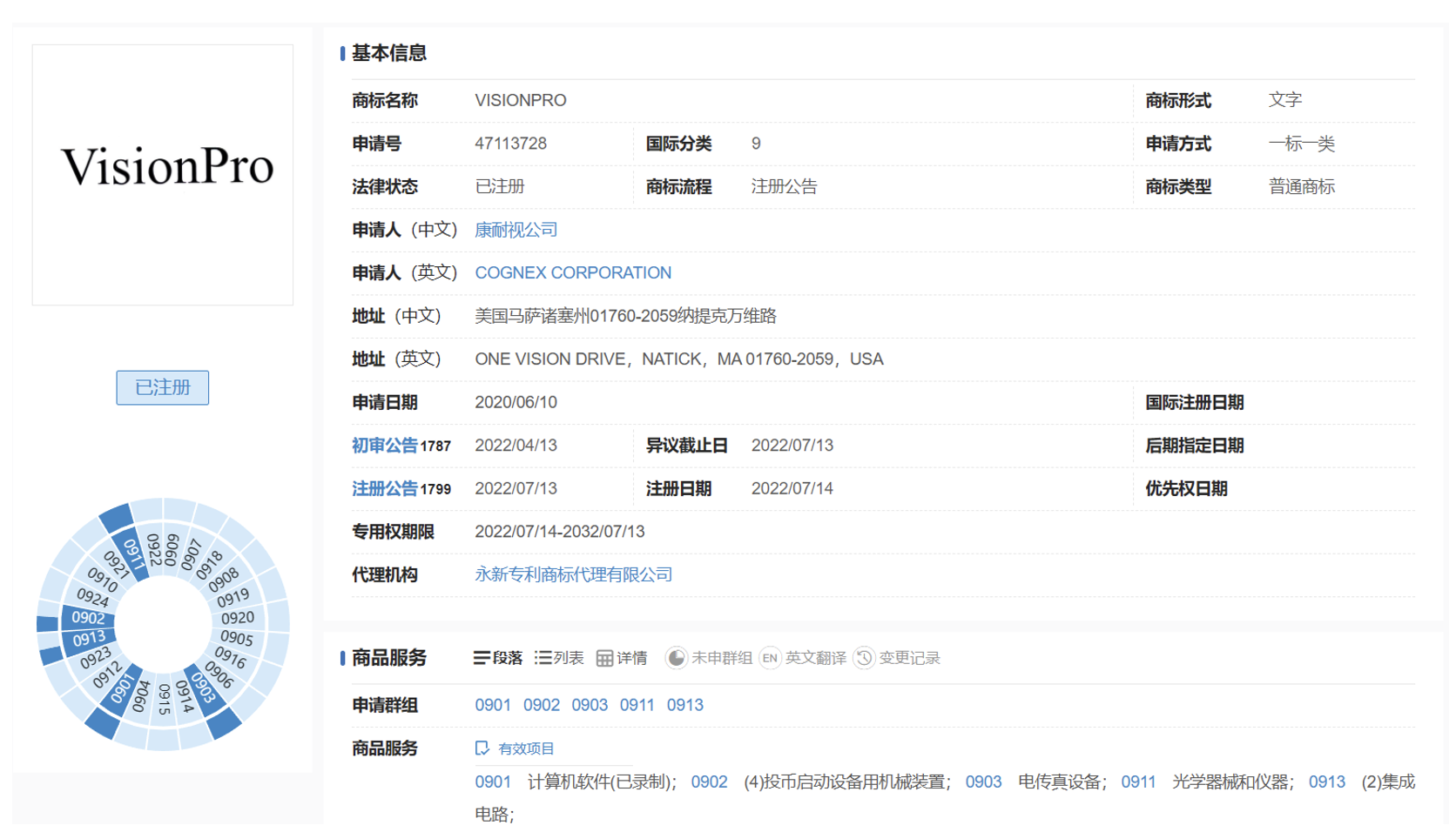 查了下驳回的原因,原来0901小类的VisonPro已经被一家名为康耐视的美国公司注册了,这个公司笔者没有听说过,但初步判断不是苹果公司的白手套,因为如果苹果公司在幕后操纵申请,商标包含的产品内容应该至少会涉及智能眼镜、穿戴式计算机这样和苹果公司新产品高度关联的产品。