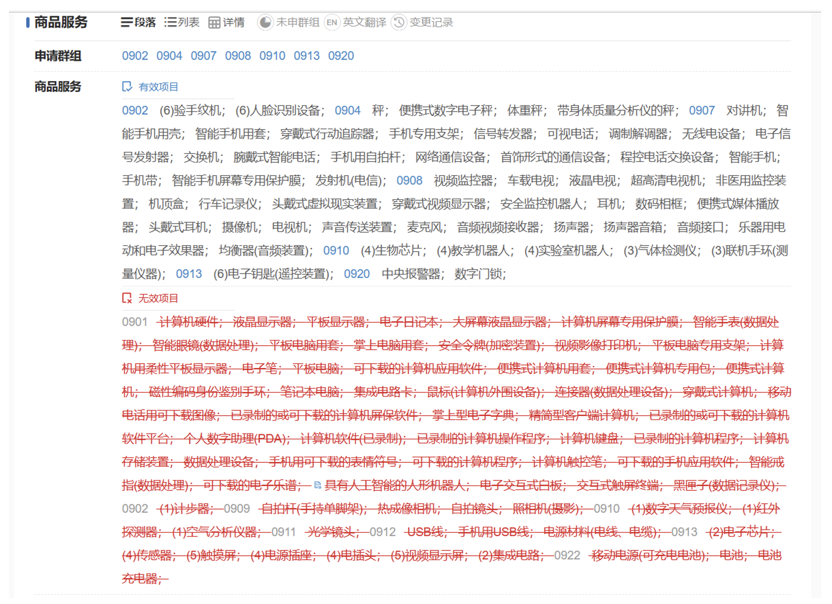 要构成商标侵权,首先你要有注册商标,然后别人的产品得落入你的保护范围才行,而苹果Vision Pro是个新产品,现有的商标局的《类似商品和服务区分类表》是不是已经涵盖了这个产品呢?笔者查询了申请人为华为公司的38242888号商标申请记录和公告记录,发现华为的商标申请中有很多内容被驳回了,大概只有一半获得了注册: