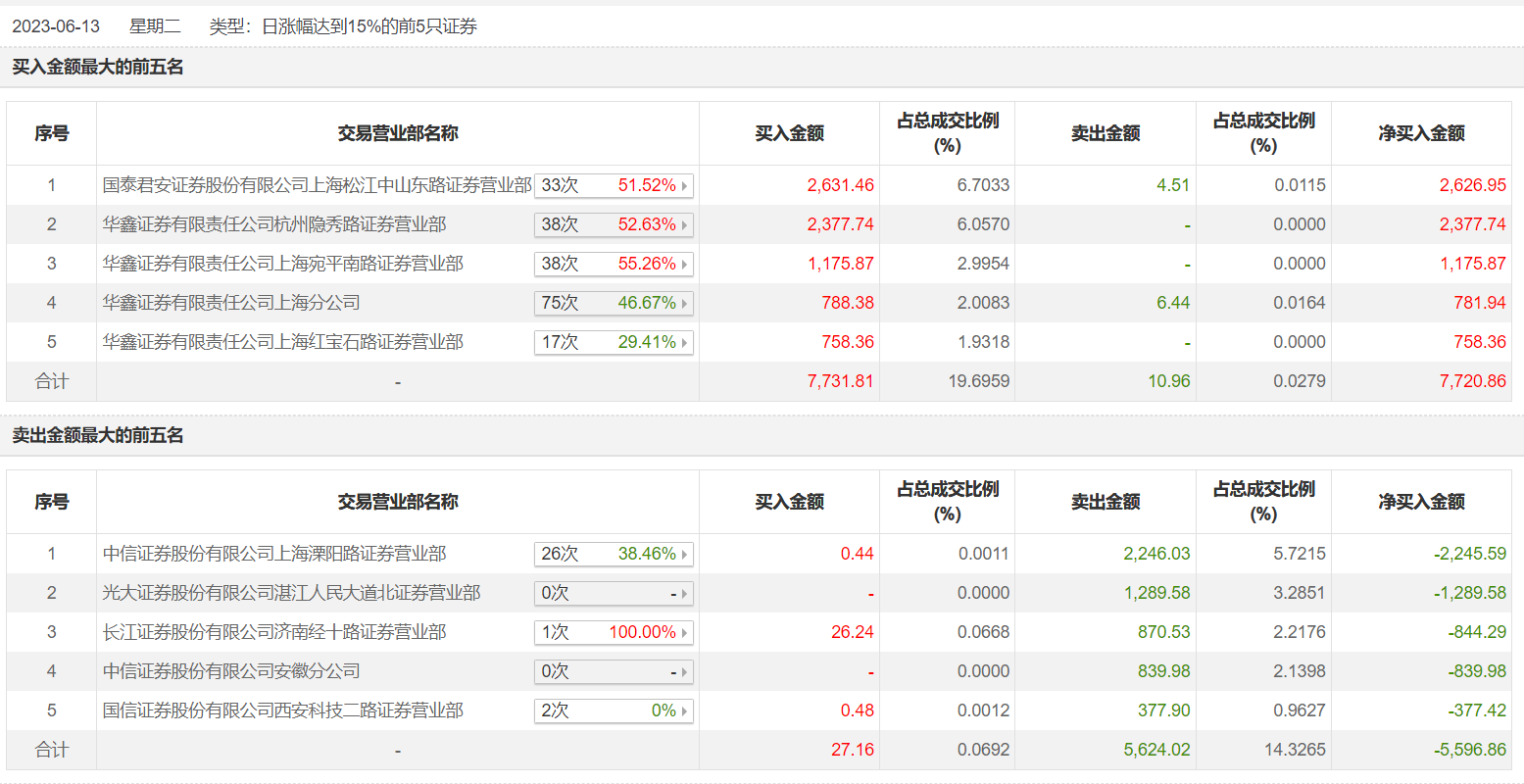 具体来看,知名游资现身龙虎榜,国泰君安证券上海松江中山东路证券营业部、华鑫证券杭州隐秀路证券营业部分别买入2631.46万元、2377.74万元;孙哥(中信证券上海溧阳路证券营业部)、光大证券湛江人民大道北证券营业部分别卖出2246.03万元、1289.58万元。