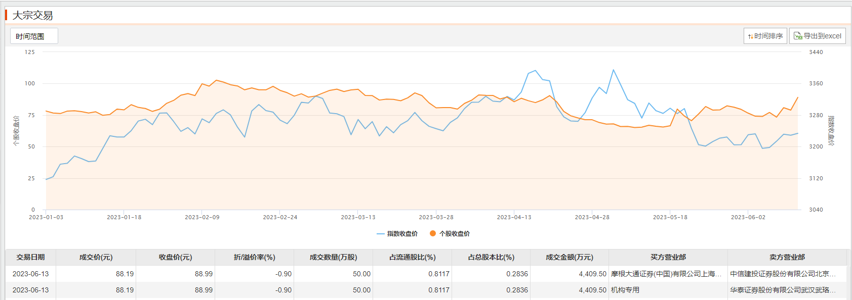 6月13日,长光华芯今日大宗交易成交100万股,成交额8819万元,占当日总成交额的13.37%,成交价88.19元,较市场收盘价折价0.9%。