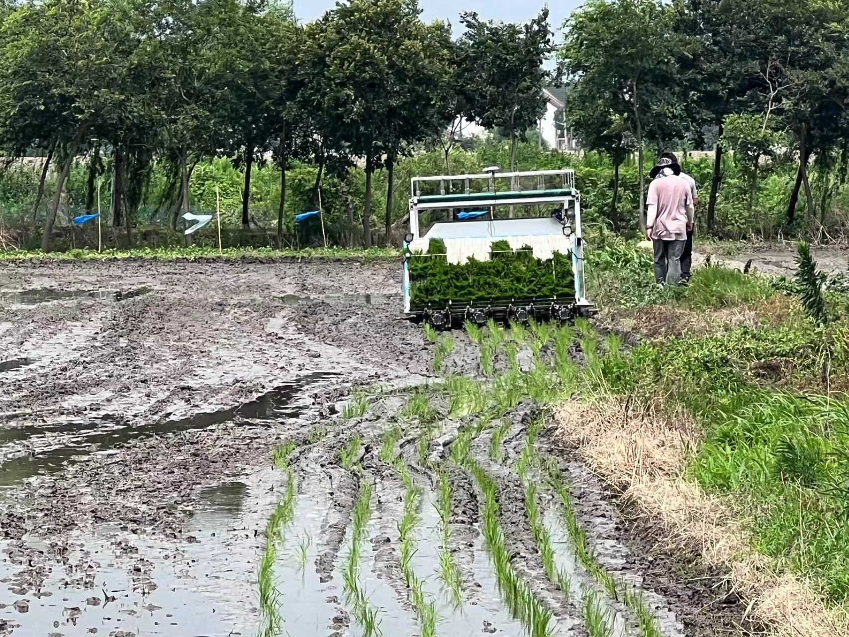 在金山区亭林镇的田野里,一台无人驾驶的点甜AI插秧机来回穿梭,机器旁只有一名工作人员通过操作手机App,对插秧机进行暂停、转弯等远程控制。