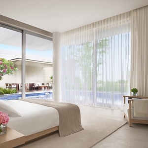 酒店共 512 间客房,包含 46 间套房和 17 座别墅,别墅沿着梯田山坡散布,都配有私人泳池。几百间客房呈梯形分布,这样所有住客都能看到海景。正是此类设计上的小细节,便能体现出对客人的考量。